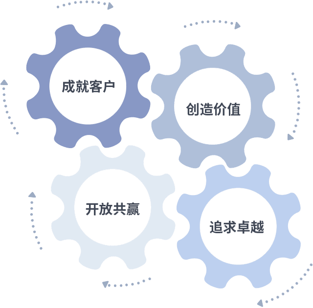 成就客户是一切决策的出发点,,,,创造价值是衡量所有工作的标准,,追求卓越是我们做事做人的态度,,,,开放共赢是我们的格局也是最终的结果。。。价值观的齿轮环环相扣,,,推动着组织里的每个人不断向前。。。。